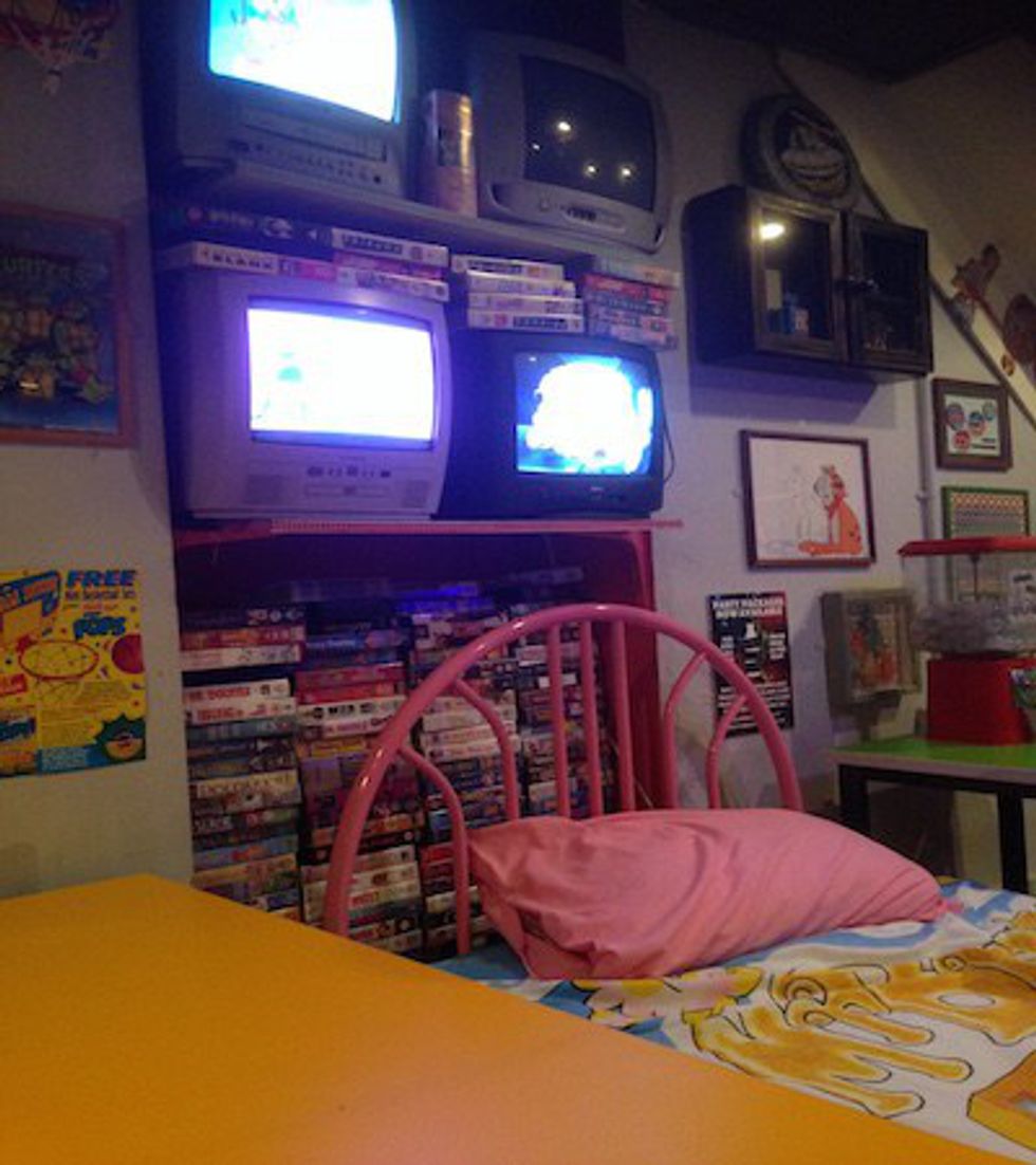 The lower level of the cafe is dedicated to an immense collection of VHS tapes from everyone's childhoods. Assuming, of course, you're aged between 19 and 30. If you can think of an obscure Disney movie that you once had on tape and swear that no one else has, they have it. Their dining decor wasn't too off base either. Instead of chairs or benches, they have twin-sized beds with colorful Teletubbies and Mr. Blobby bedsheets. Needless to say, this place was designed with childhood nostalgia at the forefront of everyone's mind, and I can honestly say Cereal Killer Cafe's owners, Alan and Gary Keery, delivered.