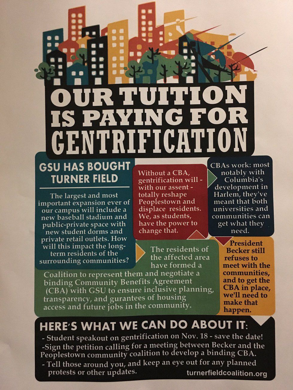 Recently at Georgia State University our campus, along with our student body, has grown considerably. Mark Becker, the President of Georgia State University, seems to not understand displacement as he signed to buy Turner Field's land to completely gentrify the surrounding area. The community that will be severely affected by this decision is Peoplestown.