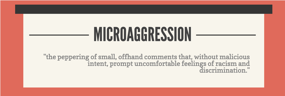 Microaggressions are much more difficult to pinpoint than blatant racist or sexist comments. For example, in my geometry class sophomore year, even when I answered the question correctly the teacher told me I was wrong, even though it was correct. Another time, someone asked me and a group of my friends how to do a problem and when I showed her how she thought I was wrong and asked someone else (it turned out I was right). Another time when I teacher asked me if I was sure I was in his class. Or in AP English when I got a 96% on my 15 page paper and another student got mad that I received a higher grade. My response to these instances is usually one of affirmation. “Yes, I’m sure.” Or I just blatantly ignore it because when you hear these comments everyday, it gets tiring to challenge them.