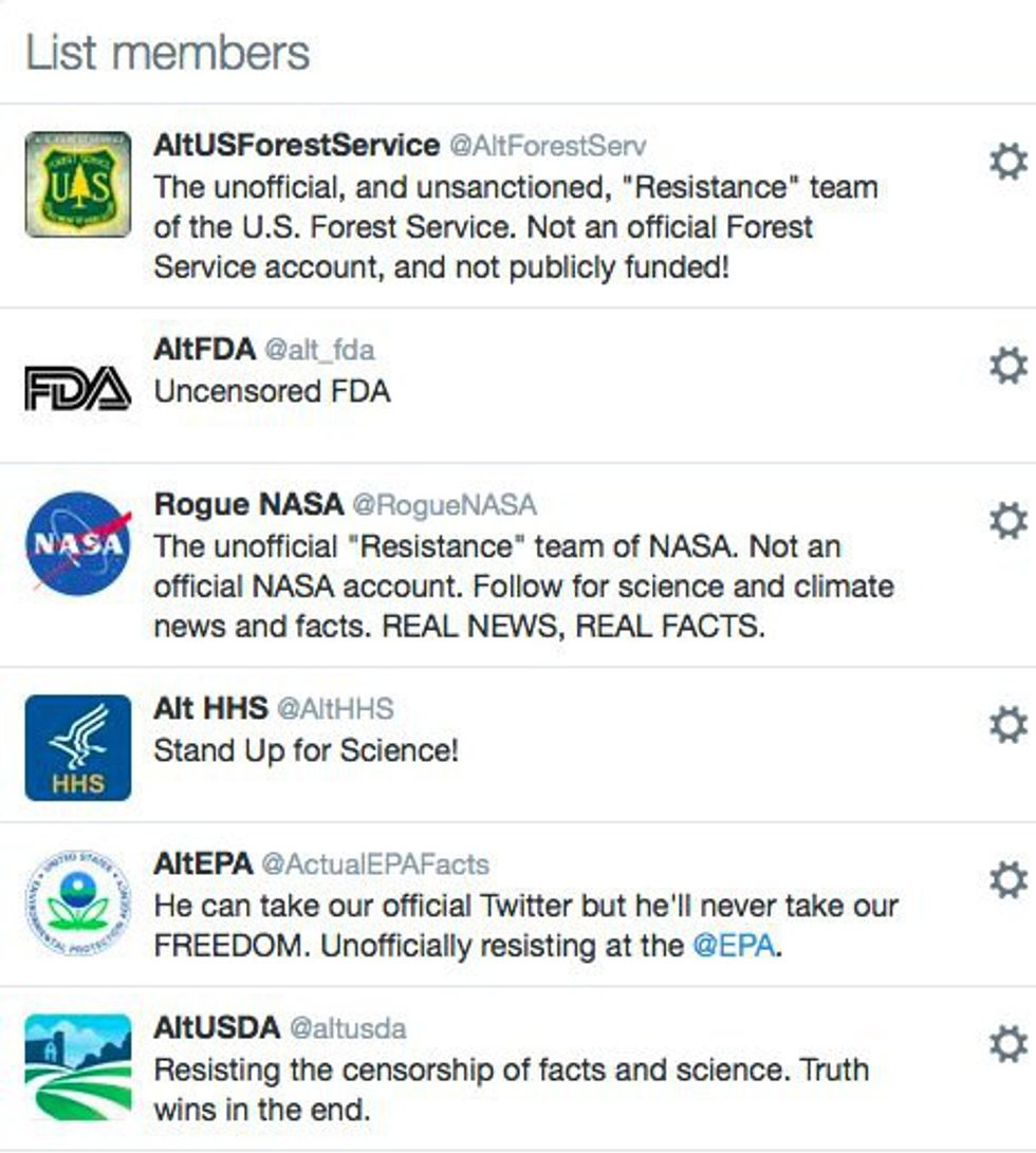 In addition, Trump's team has been trying to control what science and environment-related government agencies say on social media. As a result, many agencies have created "alt" twitter accounts to say what they really think. The list has grown beyond what is in the photo below.