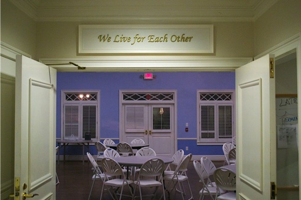 Our open motto, "We live for each other," appropriately sits above the entrance to the chapter room. This room also serves as our dining room, and when I want to see someone, my best bet is in here at 11:00 a.m. sharp when lunch is ready (especially on Queso day).