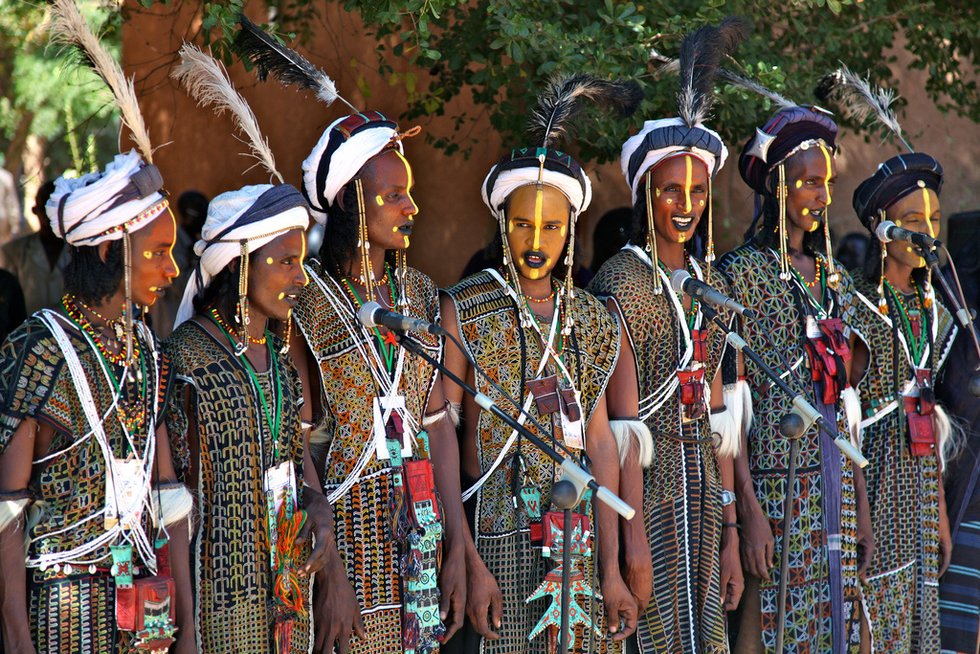 The Gerewol is an annual courtship ritual competition held by the Fulani people. In the competition, young men dress in elaborate costumes and traditional face painting. They gather in lines to dance and sing, with the goal of vying for the attention of young, marriageable women.