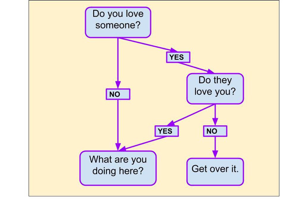 Last semester, I took a fantastic psychology class called Relationship Process and Emotion. Five out of five stars. The professor was a snappy mixture of knowledge and dry humor, and the textbook he assigned was even better. I read it cover to cover, despite the embarrassment of carrying around a small paperback entitled “Intimate Relationships” (featuring an ardently making-out couple on the front). In one of the sidebars, the author addresses "Unrequited Love," and he doesn’t pull any punches.