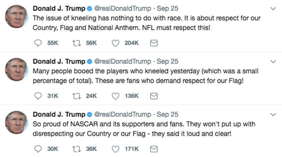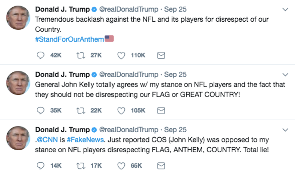 My guy, don't you have political things to worry about? Get off your phone, laptop, tablet, whatever you are tweeting from and WORK ON THE COUNTRY. Stop acting like a 12-year-old girl taking to Twitter about all of her problems. Just stop, seriously. He is acting like that middle school girl who always acts tough behind a computer screen, but when you see her in person, she is as quiet as a hat drop. I seriously never comment on political news or any sort of news in the first place, but this is all getting so annoying. I never have an opinion on anything because I just don't want people to start arguments.However, now I'm starting to see why I should have one. Trump is not even taking the time to really talk to NFL teams to see why they are taking this knee to silently protest! He automatically goes to, "It is disrespect to the flag, fire these sons of b***hes!" Because that's also a part of making America great again, right? Basically taking away a whole sport that I'm pretty sure 90% of America watches. Sure, yeah, that helps. Why haven't we impeached this man already?