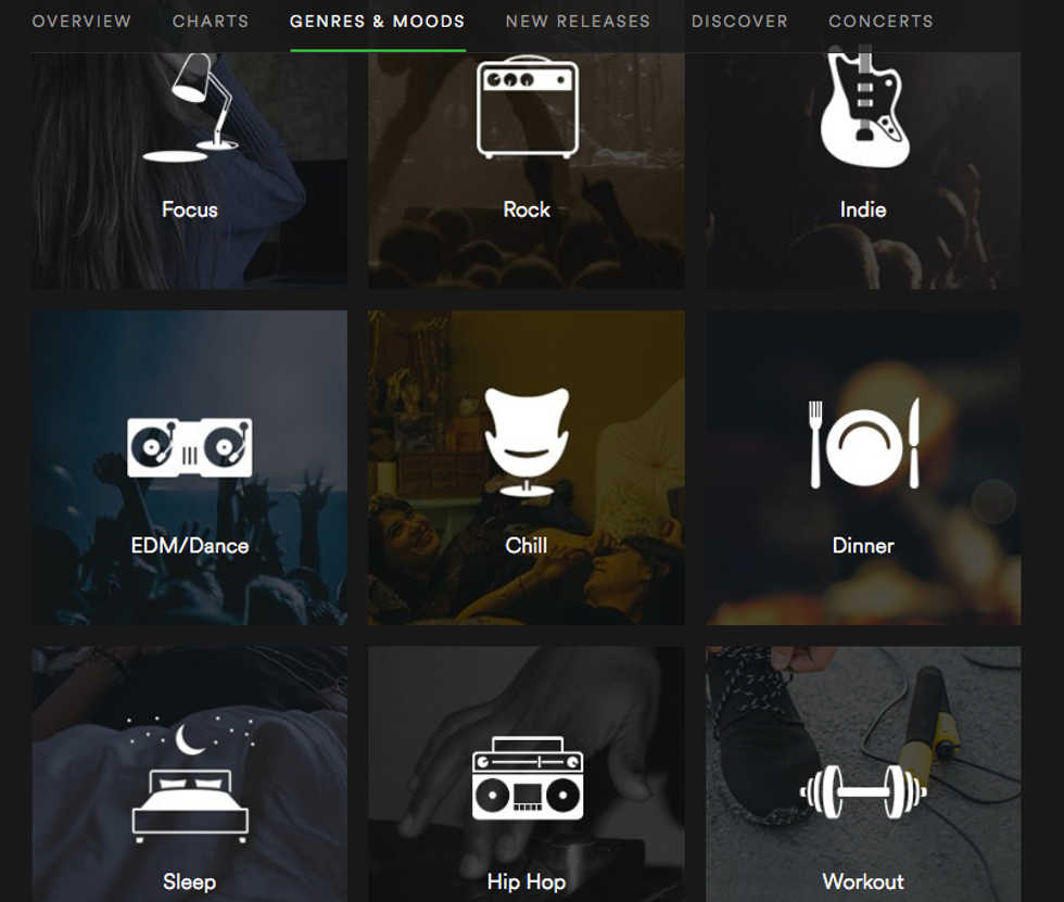 Genres & Moods: This is perfect for when you're searching for a new playlist. There are dozens to choose from and all you have to do is pick the mood you're in.