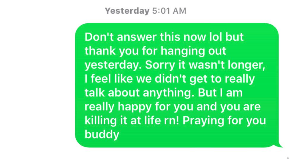 Anyways, it didn't go as planned. My old bestie wanted to hang out at the same exact time and, when push came to shove, we all ended up at the same coffee shop together. She had also just walked off a plane from Seattle and all she wanted to do was catch up. She left him high and dry in the conversation, and it ended up being her and I that really caught up and him just sitting there on the sidelines. We went our separate ways and I felt like a loser for not trying to include him more in the conversation. I had a red-eye flight that night and sent him this text from my first layover: