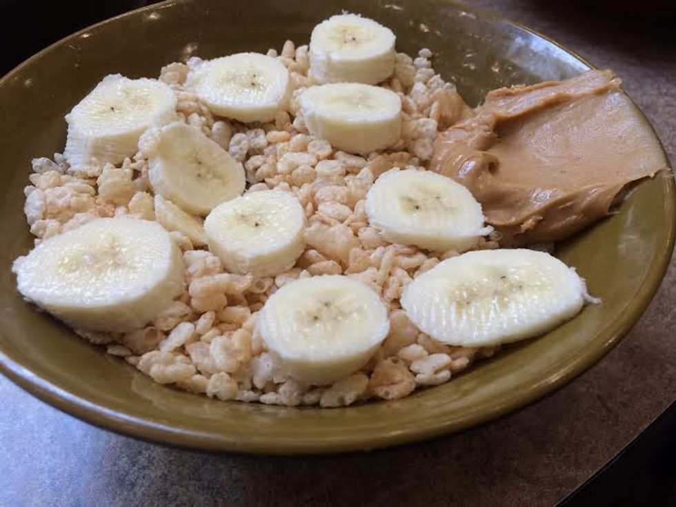 Rice crispies cereal with bananas, peanut butter, and chocolate milk.