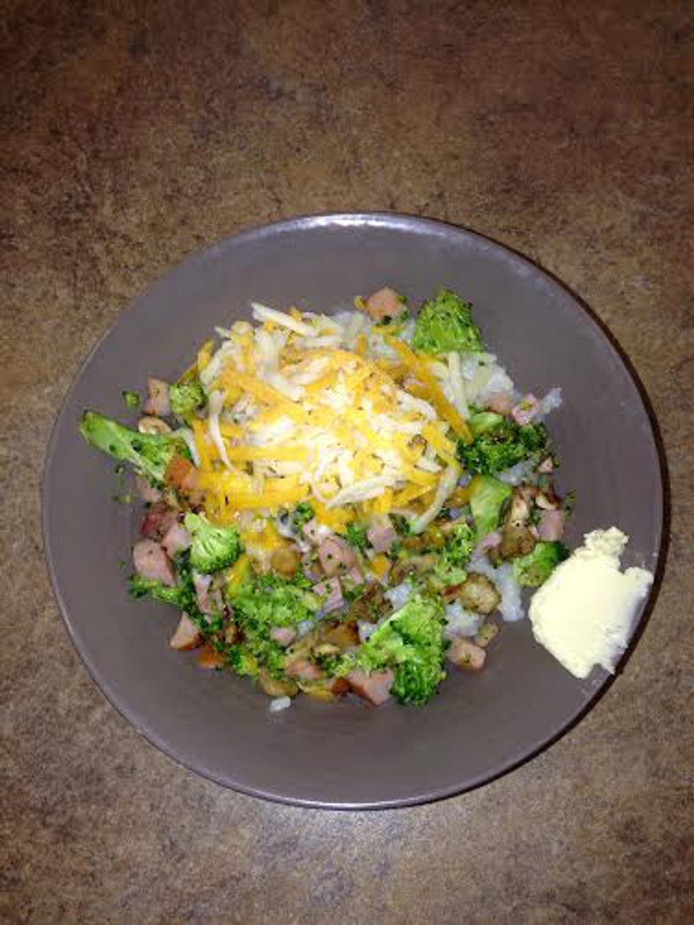 Grits from the main line plus broccoli, ham, and mushroom from the omelet station with a side of butter and cheese.