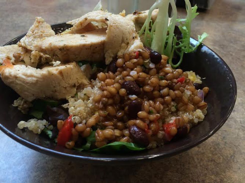 Spring mix greens from salad bar with grilled chicken and a side of quinoa and faro salad.