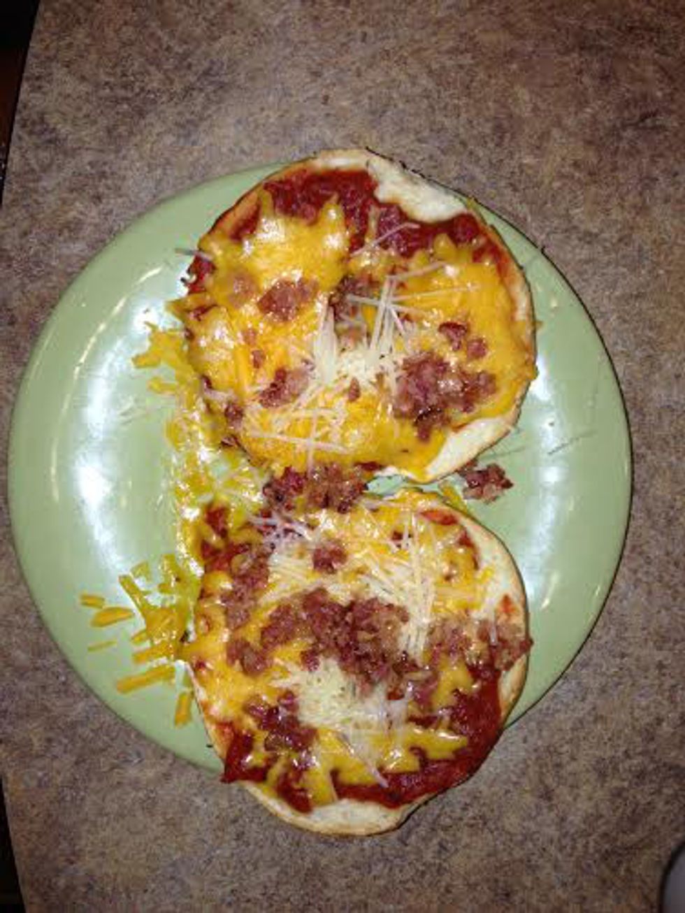 Toasted bagels with marinara sauce, cheese, and bacon bits. Pop in microwave and ~boom~ hot and fresh pizza bagels.