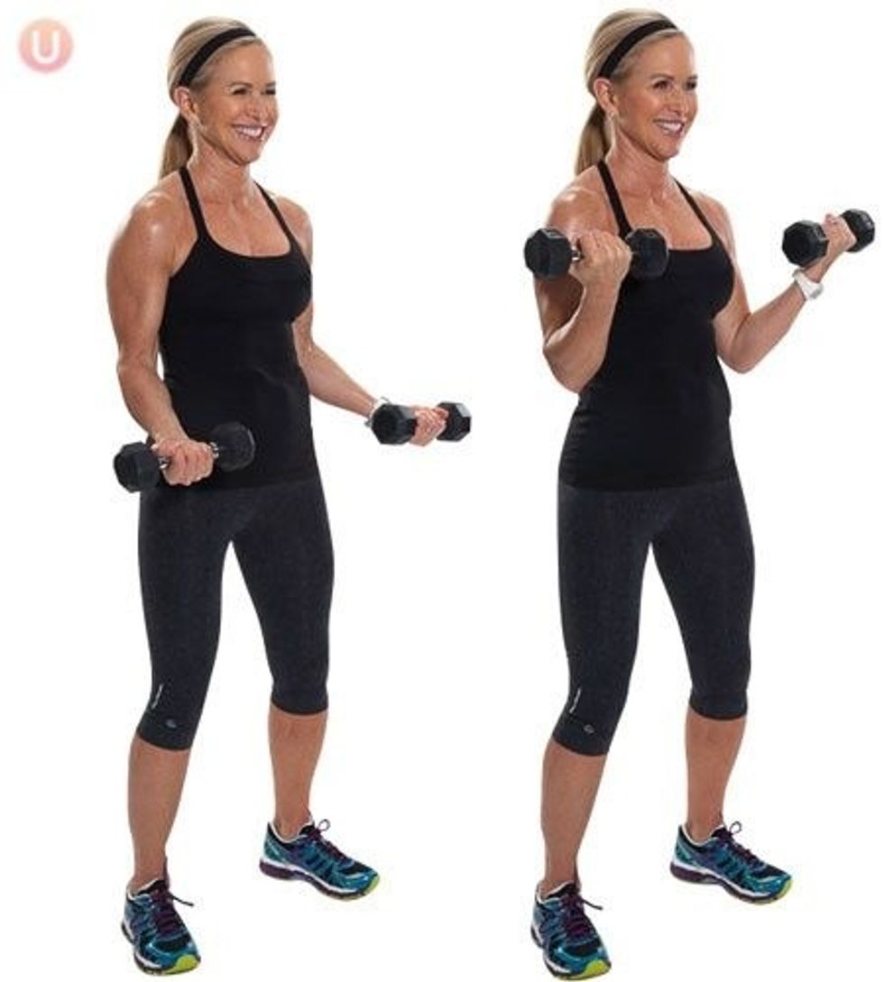 - Bicep Curls: Make sure the inside of your elbows are facing out, and hold the dumbbells straight out in front of you, keeping your arms as close to your body as possible. Bend your arms until you've lifted the dumbbells to your shoulders.