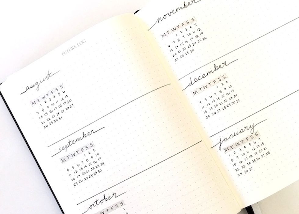 For the Future Log, creator Ryder Carroll recommends you set aside two pages and divide them into six equal parts. Add the months to each box. This gives you space to do some advanced planning for six months. The Future Log sets longer-term goals you want to achieve for the year, or map out longer projects over a period of time.