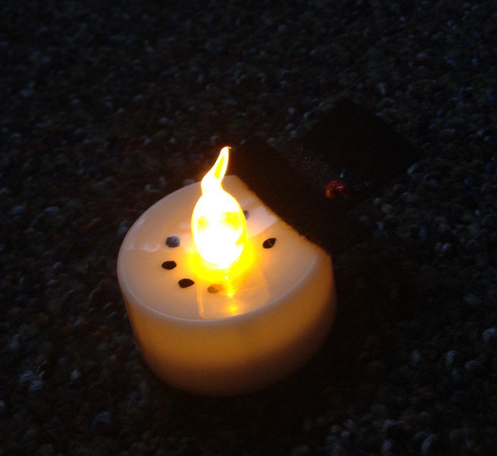 Using the black Sharpie, I drew two dots for the eyes and four dots for the smile around the light part of the candle.