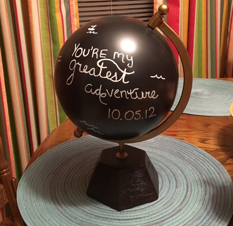 I bought this blank, black globe at Target, but you can find them pretty much anywhere. I took a white paint pen and wrote, "You're my greatest adventure" and our anniversary date!