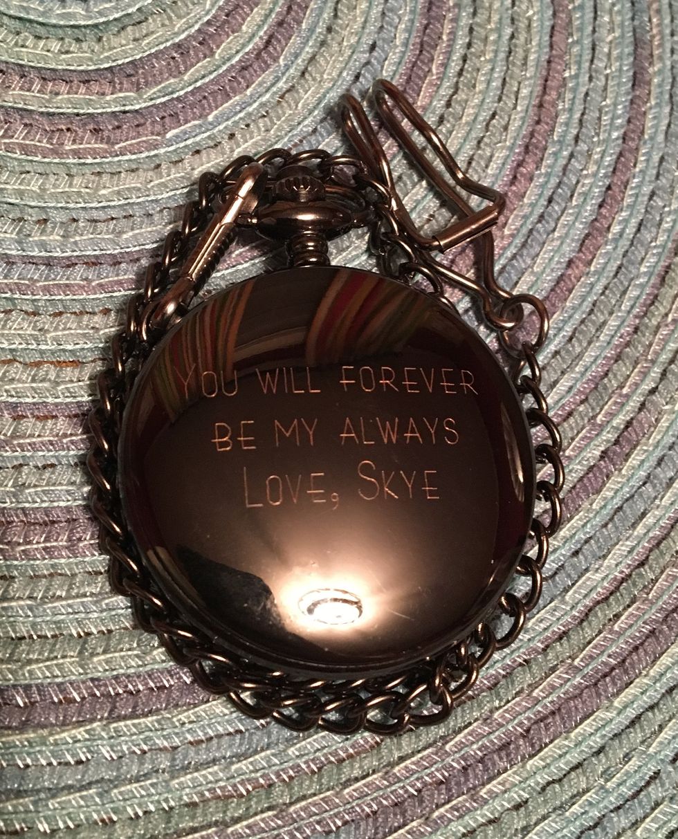 I found this by googling, "engrave-able pocket watch" and found this one on Etsy for only $20. I chose the saying based on something David and I tell each other, but obviously, you can put anything you want on it!
