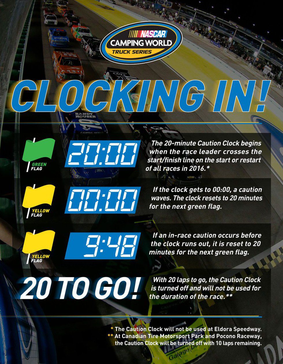 The unpopular format will consist of 20-minute green-flag time limit until the caution comes out. Excluding Eldora, the caution clock will be implemented until there are 20 laps to go (except for Canadian Tire Motorsport Park and Pocono Raceway, where it’ll be the final 10 laps). From there, there won’t be a 20-minute green flag run.