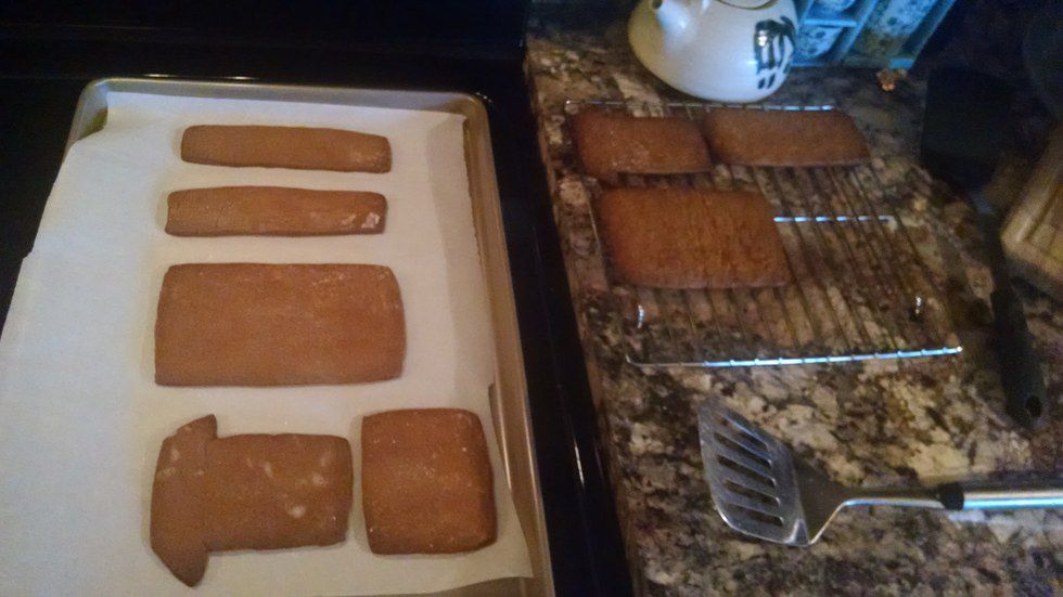 We took the gingerbread, covered it with wax paper, covered it with our design, then used a toothpick to poke out the corners of each piece. Then we used a knife to cut it, place it on the cookie sheet, then remove the wax paper. This was problematic the first time because the gingerbread had become too warm and we could barely get it off the counter.