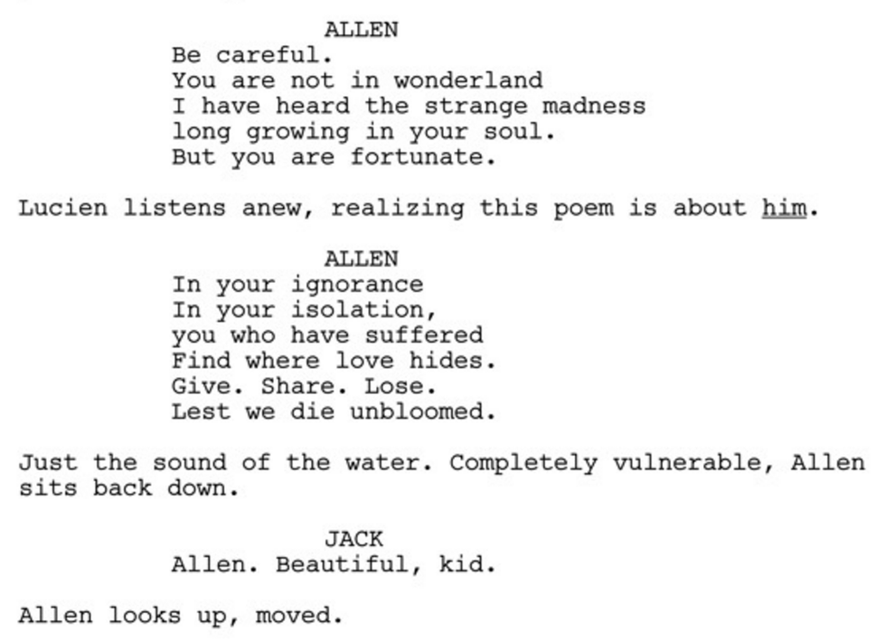 "Be careful, you are not in Wonderland. I've heard the strange madness long growing in your soul. But you are fortunate in your ignorance, in your isolation. You who have suffered, find where love hides. Give, share, lose — lest we die, unbloomed." — Austin Bunn & John Krokidas, "Kill Your Darlings"