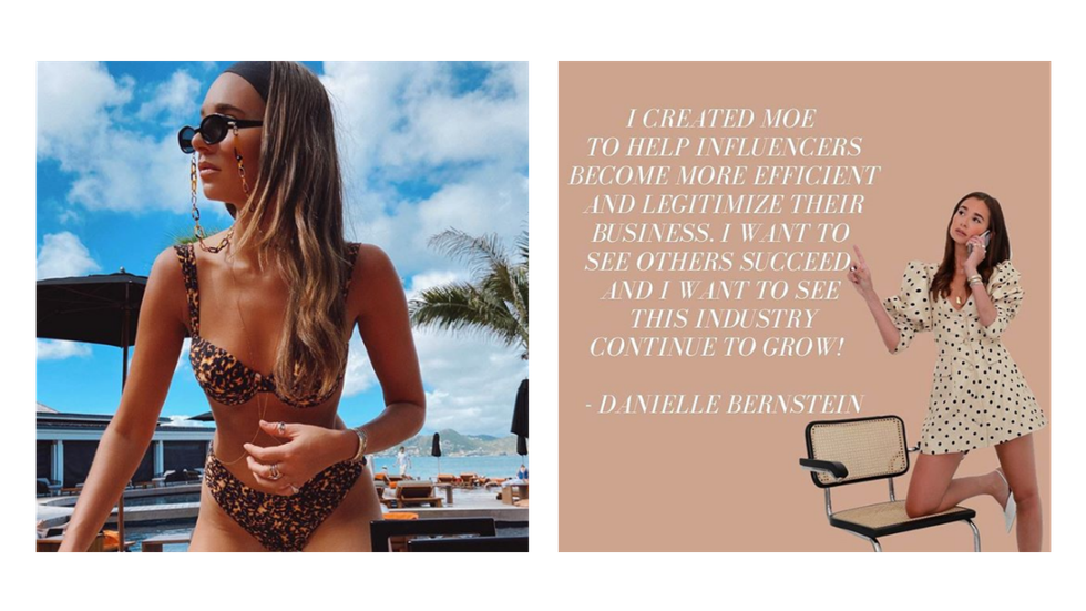 (1) Danielle modeling her pieces called the "Claudia Top + Delilah Bottom" which she created, available on her website shopweworewhat.com (2) A quote from Danielle regarding her influencer tech company, Moe Assist