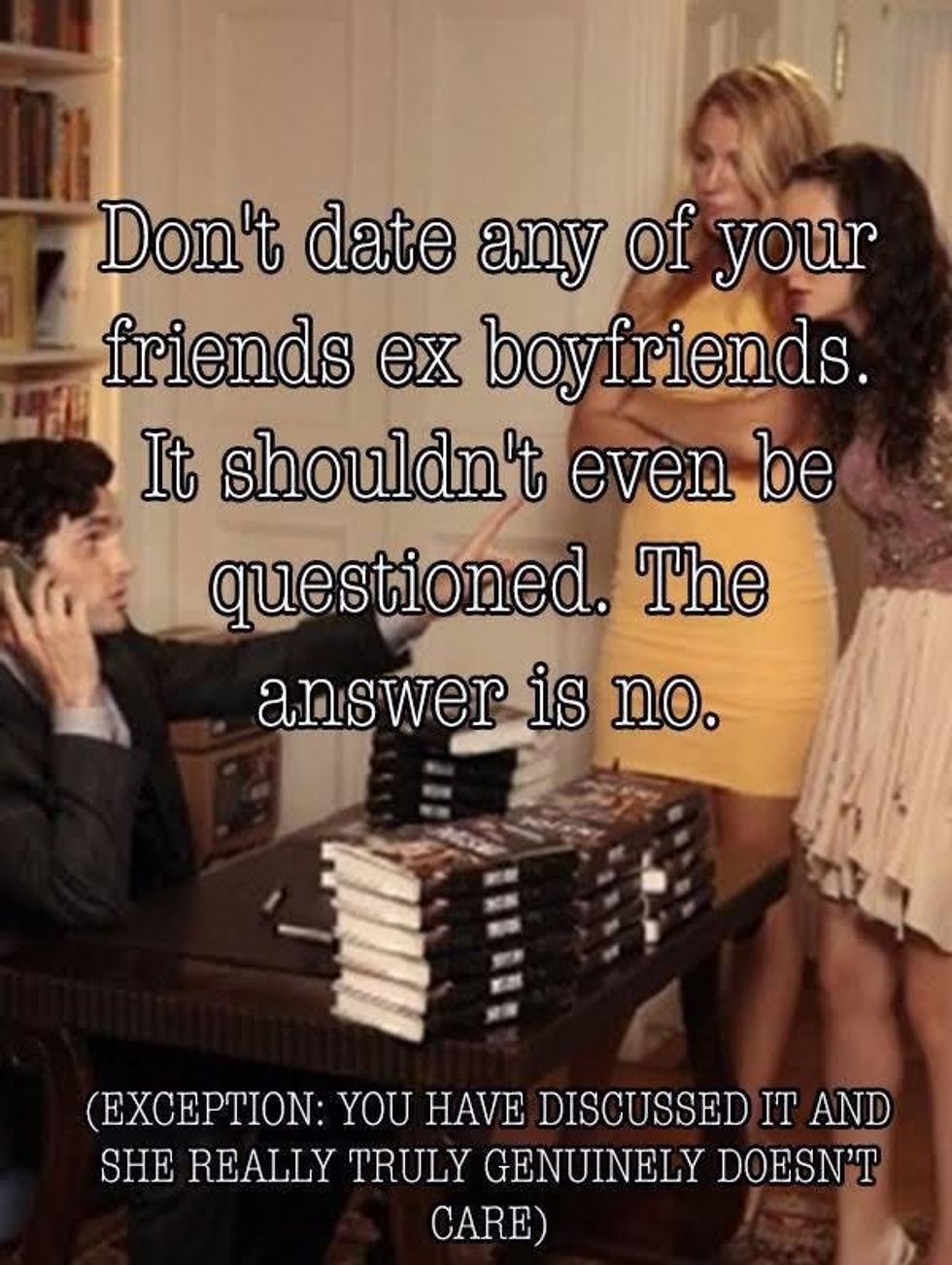 Ever meet those people who clearly have never had a true best friend, because if they did, they would understand the girl code. Girl code is pretty straight forward, and very clear. One, never date a friend’s ex, or someone they happen to be crushing on at the same time. Two, dating a family member of a friend, never ends well, so steer clear of that situation. “Don’t date any of your friends ex boyfriends. It shouldn’t even be questioned. The answer is no.”(Gossip Girl) Third, never dare flirt with a friend’s boyfriend, that is a downward spiral, and potential death situation. Fourth, siblings are off limits, same with close guy friends, it is recommended that you ask permission instead of forgiveness. Fifth, never disconnect yourself from your friends, just to become a clingy girlfriend, you will eventually have no friends or a boy for that matter. “If you cry over a guy, then your friends can’t date him. It can’t even be considered.”(Pinterest Quotes)
