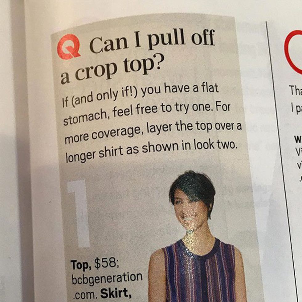 Crop tops are for us, not for any one to judge! We are our own eye candy. Look into the mirror and say “Damn, I look good.” You look good! You do! I told my story because it really was a great experience. You walk around with your belly out and it is nothing new. This magazine answer would have been the reason I would never wear a crop top to begin with, but it is time we stood up!