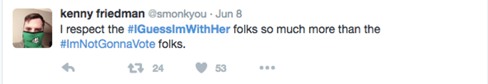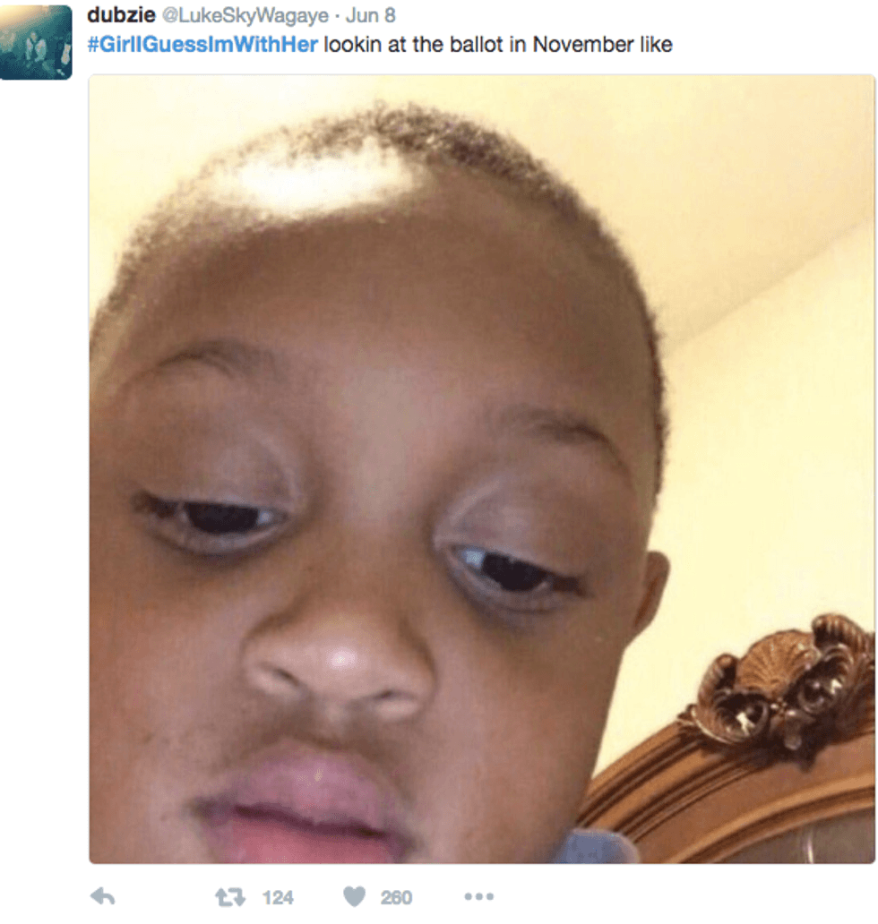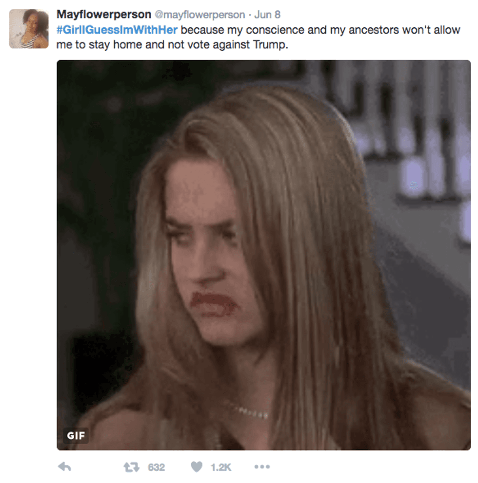 Although humorous, the hashtag is full of discontent. It carries a "I'll pick the lesser of two evils" ring to it by electing our next president through the process of elimination. #GirlIGuessImWithHer depicts what some may refer to as a broken two party system, where voters assume they have no other choice than to vote either democrat or republican (even if that means compromising their political beliefs).