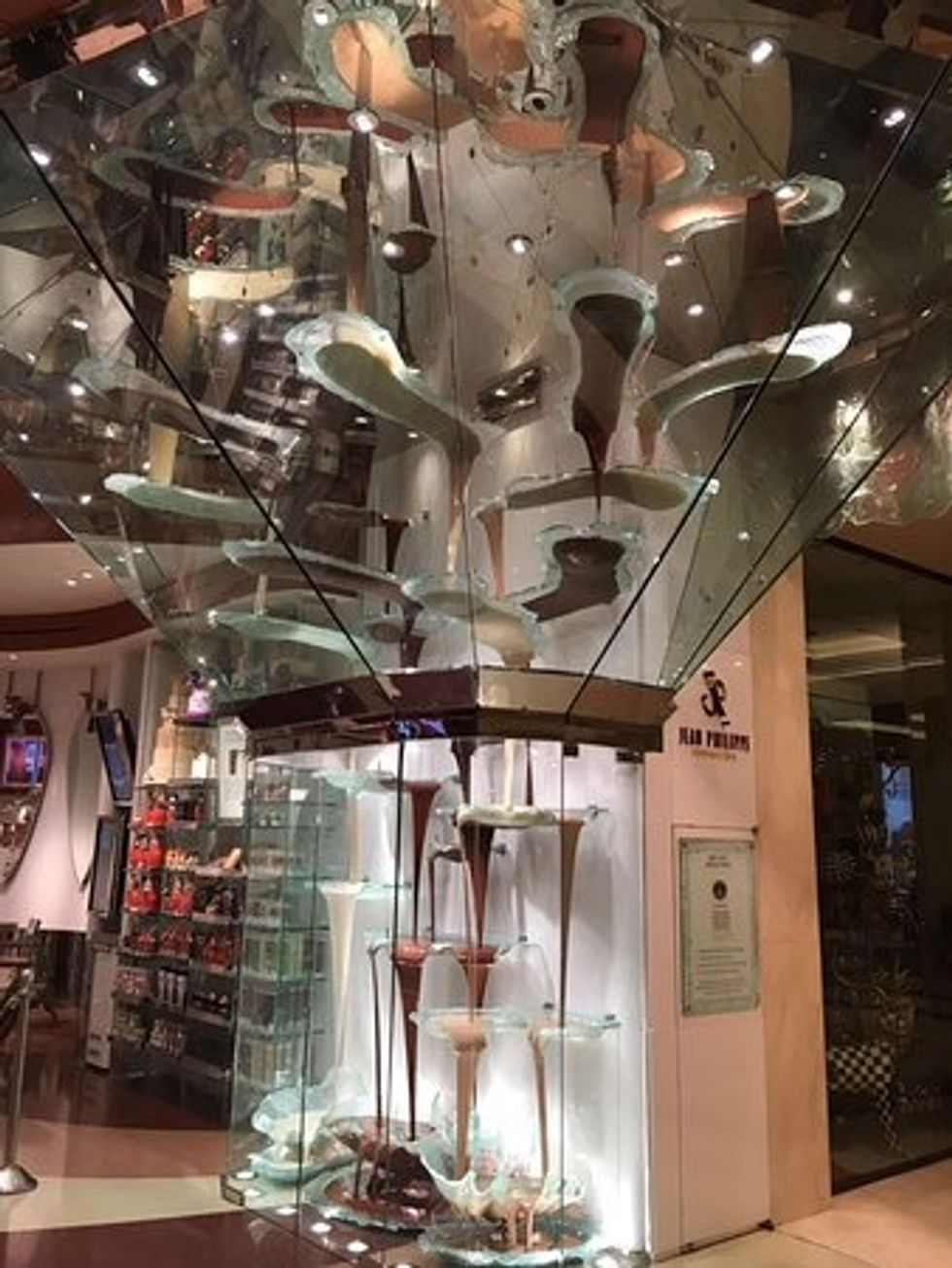 Welcome to the LARGEST Chocolate Fountain in the world! Standing at a whopping 17 feet high, this flowing fountain of goodness is no joke! Located inside Jean Phillipe Patisserie at the prestigious Bellagio Hotel in Las Vegas, this fountain took over a year to build and design and looks like something straight out of Willy Wonkas Chocolate Factory. Thankfully, theres a protective glass wall so theres no chance of anyone (like me) falling in!