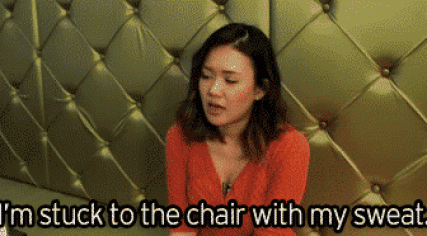 Unless it's a comfortable surface where it's cool, I almost want to refuse to sit in the summer. Your legs stick to chairs, so not only do you have to peel yourself off and deal with that pain, but your legs have the pattern printed on them for a while. Plus, you are more than likely to leave some sweat behind. Seriously, you sit on a metal chair for even a few minutes, you standing up and it's wet. Once again, girls are gross.