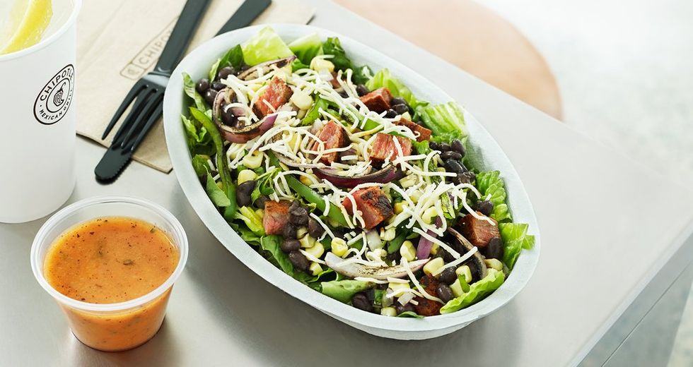 A soft bed of Romain lettuce with her favorite meat or sofritas. Topped with beans, salsa, sour cream, and cheese. Good choice for when she wants to eat healthily but needs her Chipotle fix.