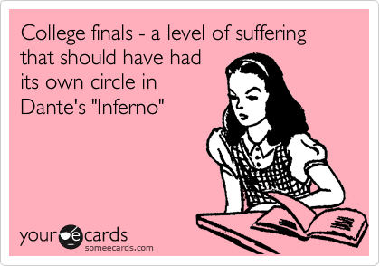 Ah, the holiday season is finally upon us! And what else does the most wonderful time of the year bring with it, just for us lucky college students? (Drum roll, please.) Finals! (Crowd boos in unison.) To say that college students everywhere dread finals time would be an understatement. It is a week to a week and a half of pure, yet somehow still legal, torture.