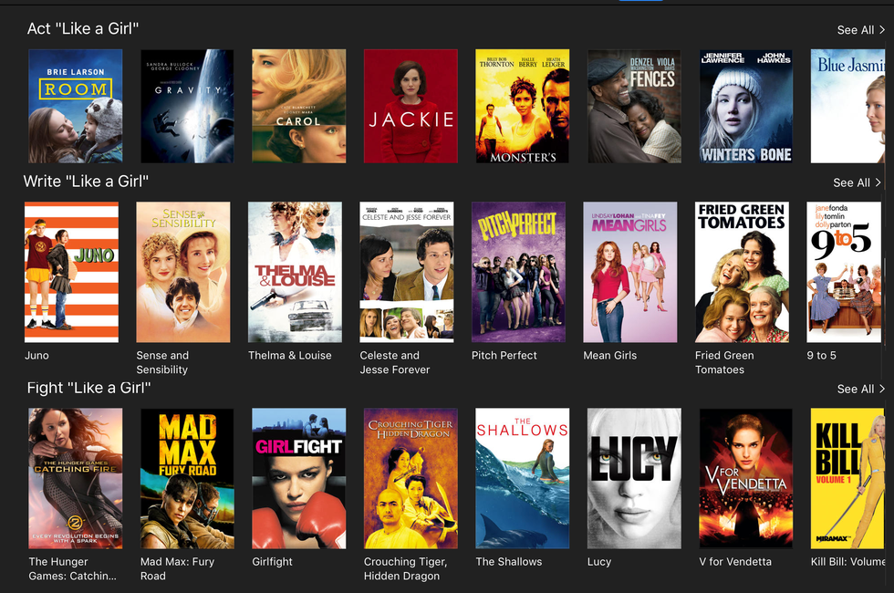 On the “Movies” page, there was no longer a header reading “New Releases” but instead several headers reading: “Act ‘Like a Girl’”, “Fight ‘Like a Girl’”, “Direct “Like a Girl””, “Write ‘Like a Girl’”, “Lead ‘Like a Girl’”, “Live ‘Like a Girl’”, and “Laugh ‘Like a Girl’”.