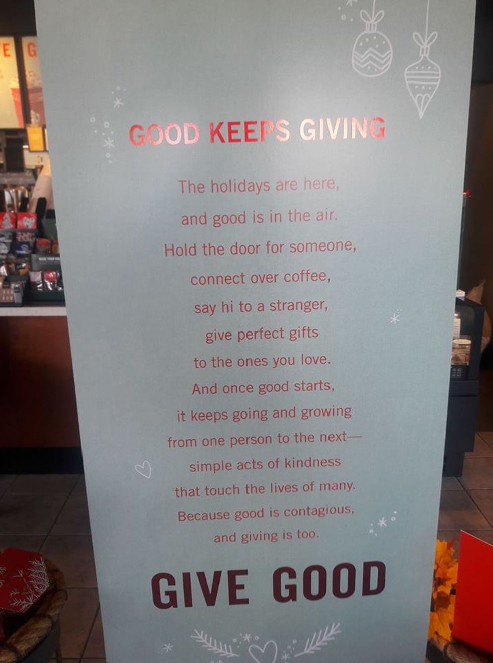 At Starbucks today I saw this sign and I was compelled to share it everywhere as this is the message that we all need to adhere to in these troubled times that are facing our country now. It seems as though we are a very divided nation and the only way to bring us all together is to begin showing everyone that service to humanity is the best work of life. It is time for us to all find ways to make compassion and kindness rule our day. It is important for all of us to find common ground and create win-win situations in each encounter we have during the day. When you do good it has a ripple effect and as a result we experience a positive shift in our personal, professional, and spiritual life.
