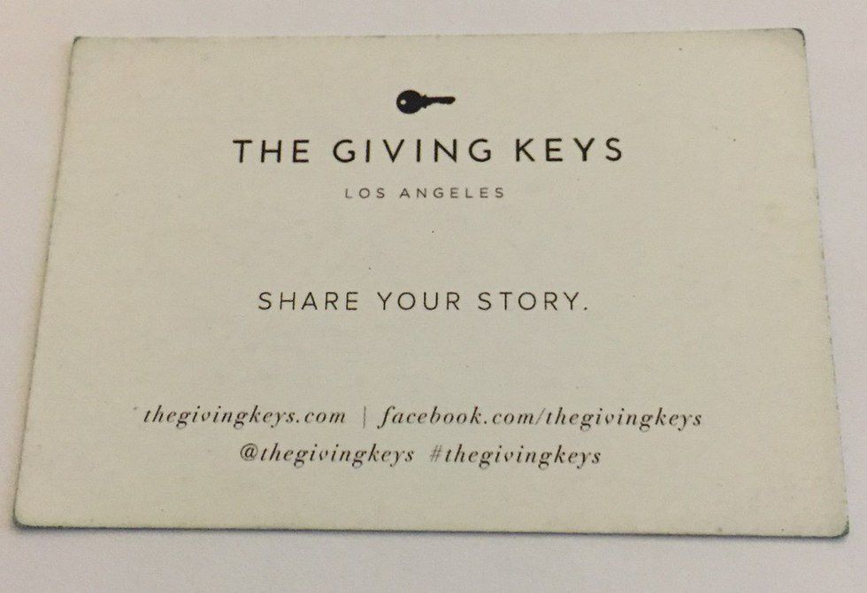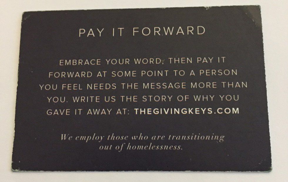Purchasing a key affords someone the opportunity to start anew. Your ideals will be mirrored in your key. Sharing your key with someone else brings the entire experience full circle. The Giving Key company provides a unique product that benefits all who come in contact with it. Like every person, every key has a past, but its future is in your hands. Many take great care in picking a message. Somehow, picking the one word that exemplified me caused me to take an objective look at my life. What did I stand for? Who was I really? It's funny how something so small could peak that sort of questioning. My message came to me in a less theatrical way, but it's mine all the same.