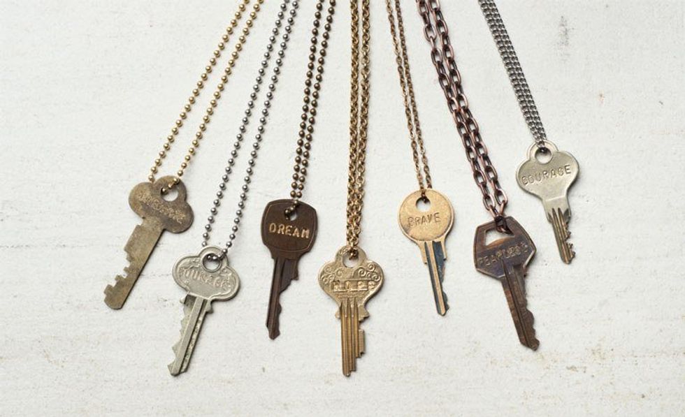 "This story begins with a New York hotel room key. Actress and singer/songwriter, Caitlin Crosby, started wearing the hotel key as a necklace while on tour and had the idea to start engraving old, used keys with inspirational words. Realizing that, in a way, we are all like these keys – unique, flawed, scarred, and sometimes discarded by others – she wanted these keys to have their purpose renewed over and over again."