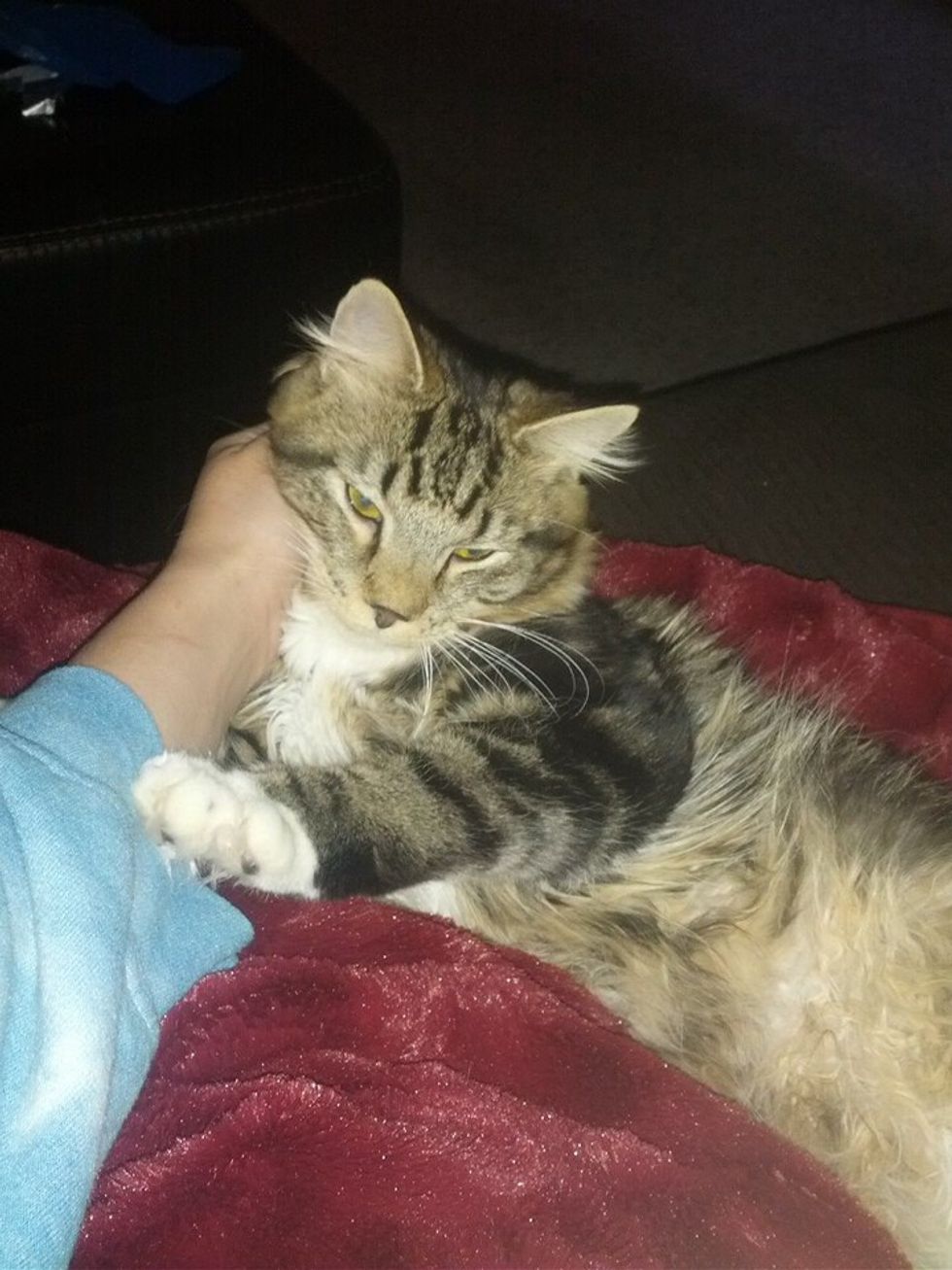 In Autumn of 2013, my mom searched for weeks to find the best kitten she could for my sister for her Christmas present that year. She had finally found a kitten online that was for free. Little did we know then how special this kitten would really be. When we got him we thought it was very odd how big he was for his age. He was only seven-weeks-old when we first got him and we thought he was so much older. He had the fluffiest tail I had ever seen. It looked just like a raccoon's tail! His tail was so fluffy that I thought that he was scared all the time! Tucker is the absolute most loving cat I had ever come across in my life. His purr was always so loud that you could hear it all the way across the room! On Christmas morning that year when my sister got to meet her new fur baby she was overwhelmed with joy. Even more so when she learned how lovable he was.