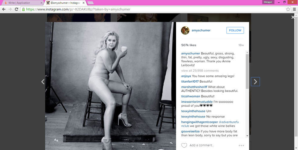 Glamour Magazine recently put out an issue that included a list of women who "inspire them" and included Amy Schumer in a list of "plus size women." Amy has been criticized for her weight since she became super famous. Less focus on her talent and hilariousness and more focus on what dress size she can fit into. Amy has never been one to shy away from the talk either; she's more than happy to post some naked pics on her Instagram to prove her confidence.