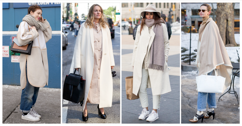 Soft neutral tones emerge as colors of choice for women on the snow-covered New York streets. The overall mood leans towards a relaxed chic, ranging between elegant and casual looks. Voluminous layering is key: women pair their favorite denims with drapey blanket ponchos, long-line shacket hybrids and roomy overcoats.