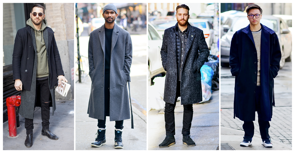 New York men brace chilly January streets, making a statement with multiple layering. Long tailored jackets cover layers of textural contrasts, knits, and quilted nylon, resulting in varying hemline proportions. The overall sophisticated look gets a streetwear vibe when mixed with hooded sweats and casual footwear.
