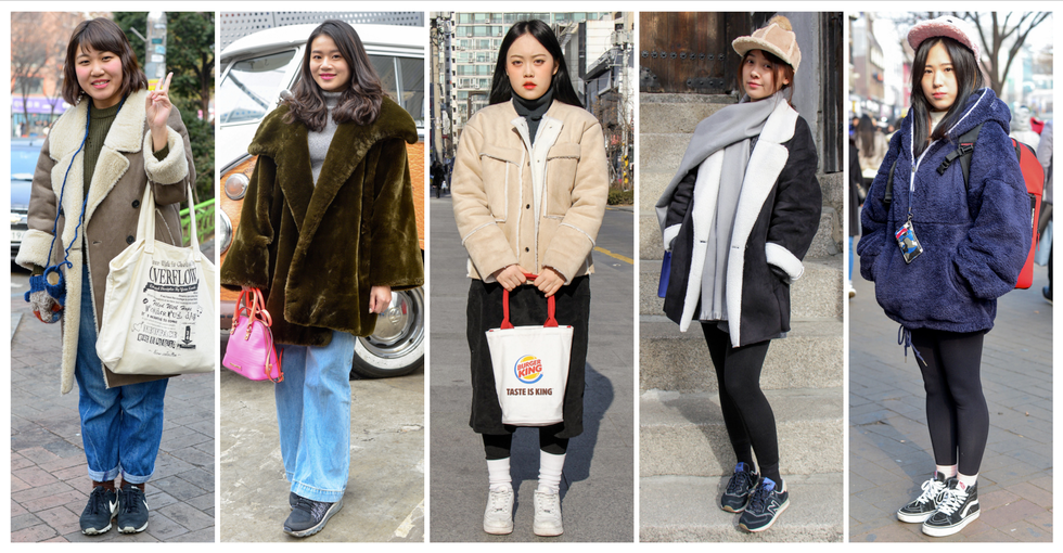 Girls in Seoul embrace bulky plush jackets to stay warm. Sueded shearlings and piled furry fleece adorn outerwear and caps alike, adding a cosy tactile update. Comfort remains key with girls easily blending sneakers with multiple outfits for casual contemporary looks.