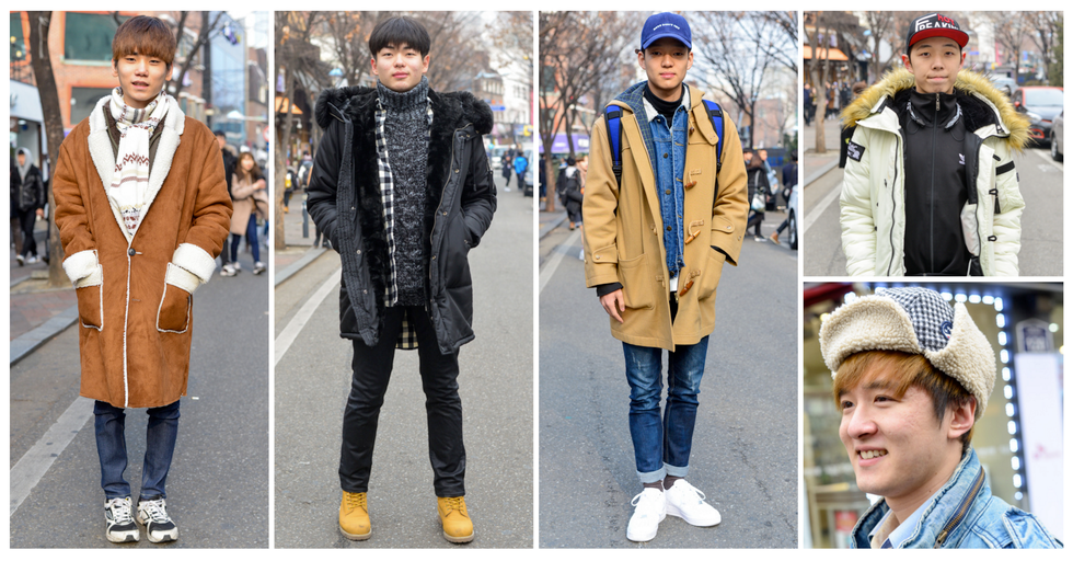 Young men on the streets of Seoul resort to bulky multi-layering to combat the cold. While hoods are trimmed with thick furs, suede shearling appears on jackets and caps. Overall styling is casual, mixing slim denim bottoms with chunky woolens, flannel shirts, truckers and heavy padded outerwear.