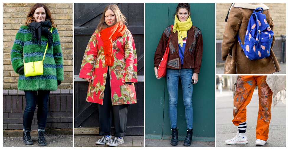 Women on the streets of London beat the January blues by working bold pops of color into their ensembles. Classic bottoms are paired with statement jackets or bright separates featuring vibrant mixes of pattern and color. High-contrast accessories add further fun to these eclectic, youthful looks.