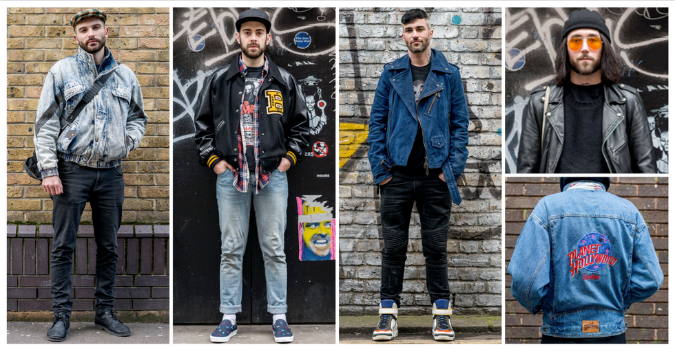Men in London look to strongly nostalgic retro looks for January, with colorful accessories, collegiate batches and vintage embroideries accenting black and indigo looks.