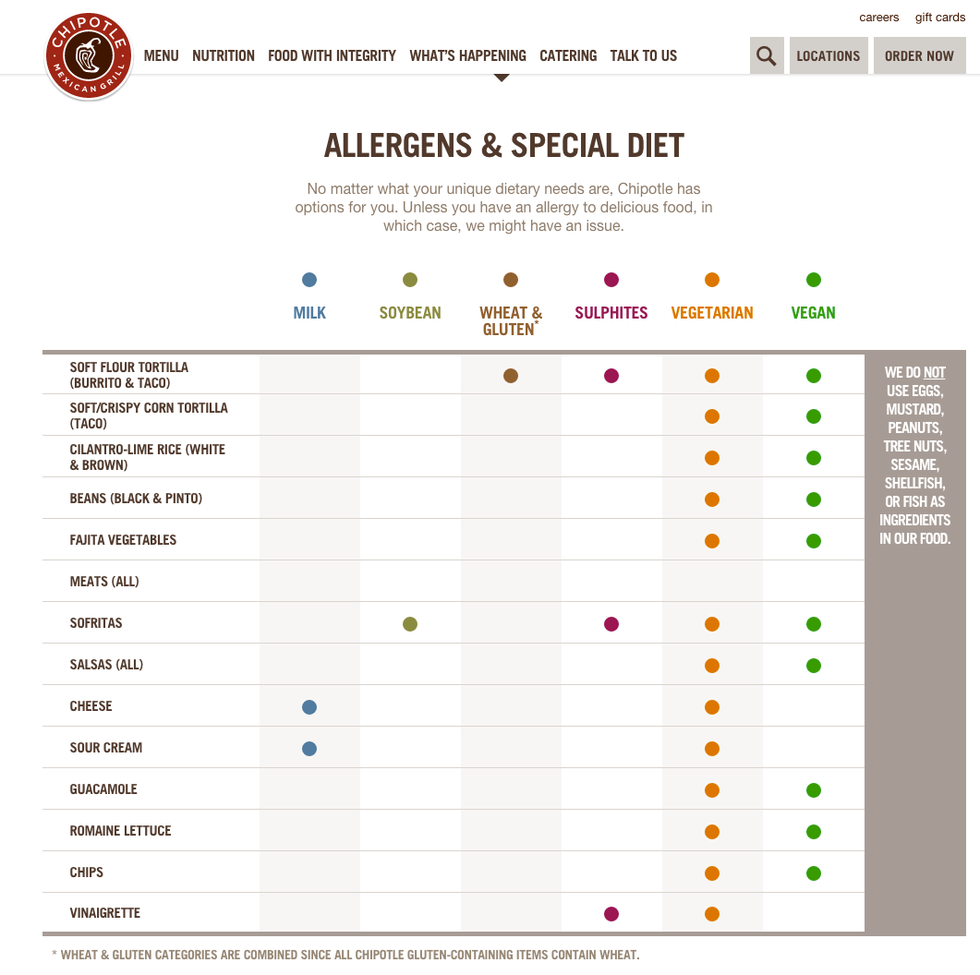 Chipotle is another "healthy" fast food option, when you're in a pinch--or, if you're like me, if it is any day that ends in -y. My recommendation here would be to tell your server that you have an allergy, so they change their gloves because, otherwise, the chance of cross-contamination is pretty high! Depending on your sensitivity, do your thing. Overall, they are really helpful in terms of allergens. Getting a burrito bowl here means no wheat, but it also means I can save it for a midnight treat!