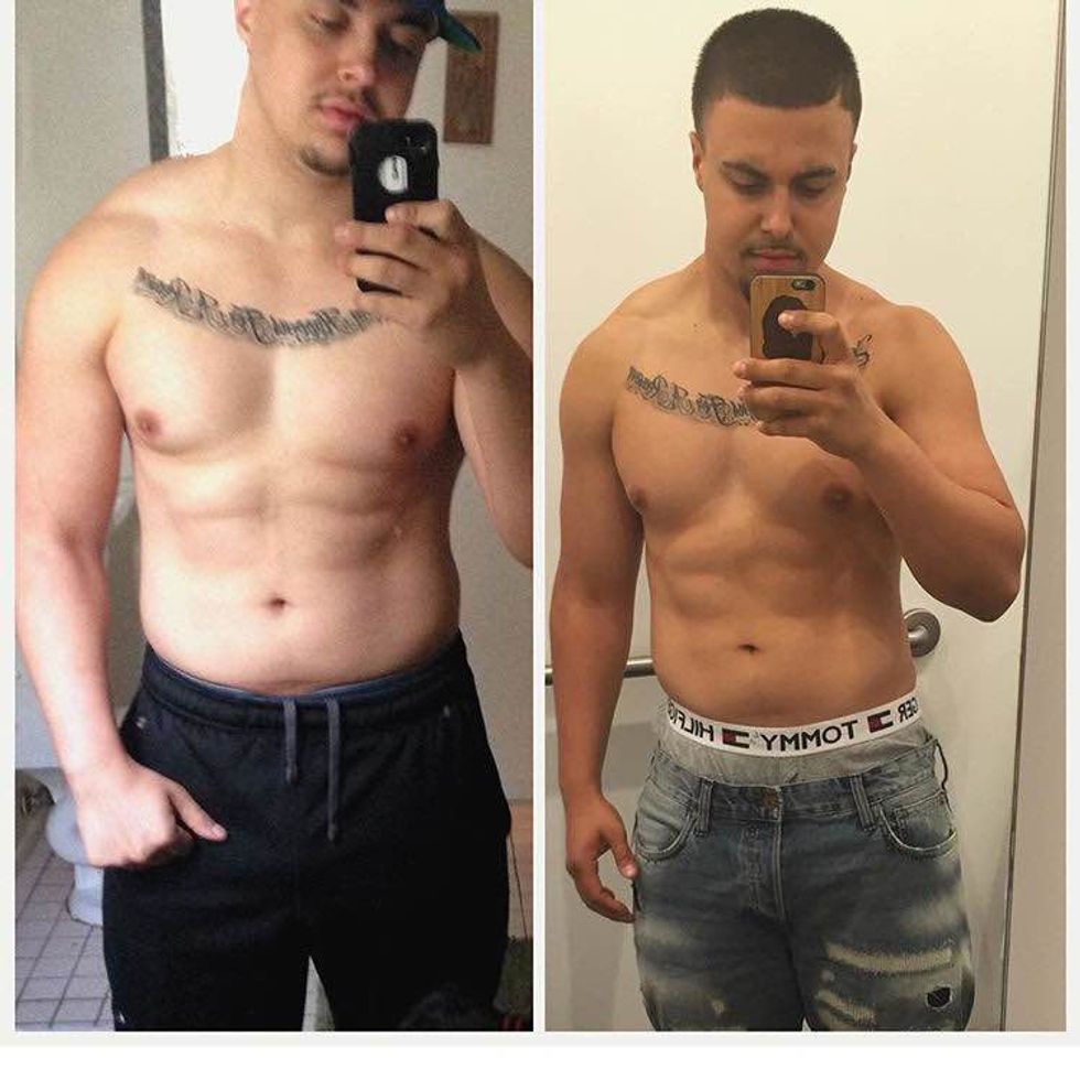 My reduction of body fat all started spring break my Sophomore year. I visited this Cafe by my house in California when I was back home and started talking to this ex-body builder who owned the place. He told me I was pretty buff for my age. I told him that I wanted to stay buff, but I had a problem reducing my body fat. I mentioned that I work out harder than anybody I know, yet I can't get rid of this body fat. I even told him that I eat a good amount carbs and protein. He told me an extreme to cut my body fat: only eat protein (meat, poultry, fish, etc), vegetables, and fruit. I listened because I was desperate to lose body fat at that point. From spring break through the middle of summer, I was strict about that diet and I had lost at least 20% body fat (I don't know the exact amount). Here's a transformation picture.