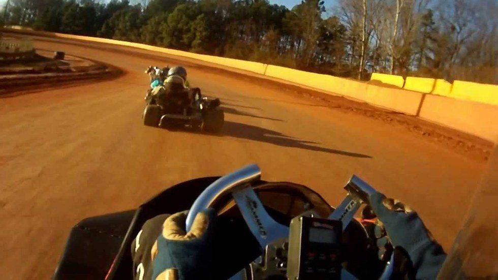 I whipped on the track and started flying around the first turn. Tires skidding, dirt flying in my eyes and all over my pants, I loved it already. I automatically didn't care what the people around me were thinking. The main reason why I didn't want to get out there was because I was worried what they would think about me. I didn't want their judgement. I didn't want it even though I only knew two people out there, Erik and his dad.