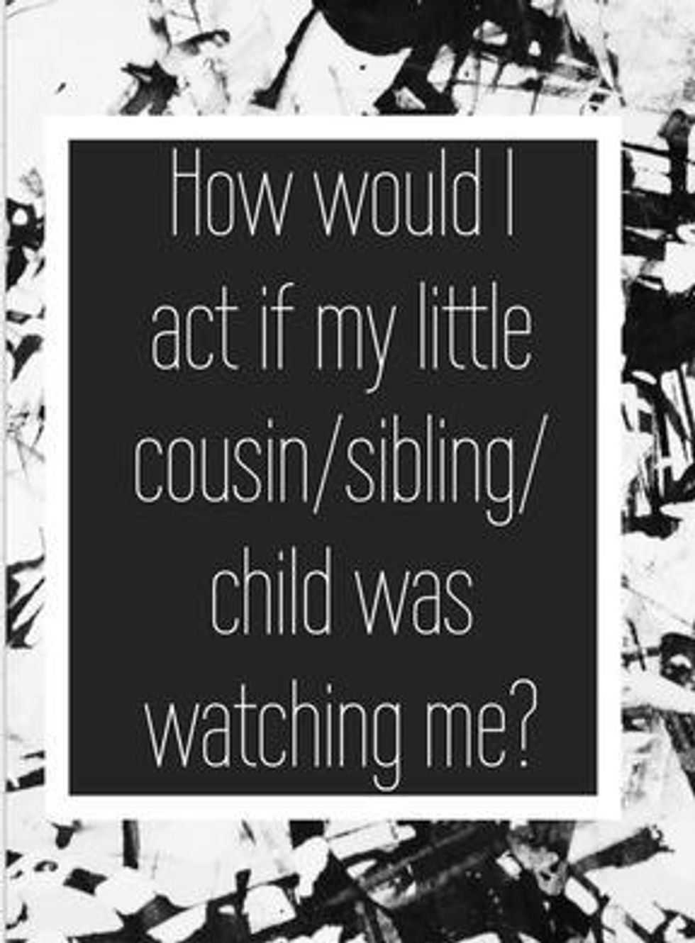 #4. How would I act if my little cousin/sibling/child (insert any other young person) was watching me? This question is something I was always told as a cheerleader in high school, and it's stuck ever since. If you have kids, siblings, or cousins, whether you like it or not, they are watching you and mimicking you. I can look back on my childhood and still remember the "older kids" and adults that had a huge impact on me. Ask yourself if you are setting a good example for them when pondering an example. I always think about my 9 year old brother when I'm in these situations. I absolutely love him and want him to be the best he can be- and that example starts with me!
