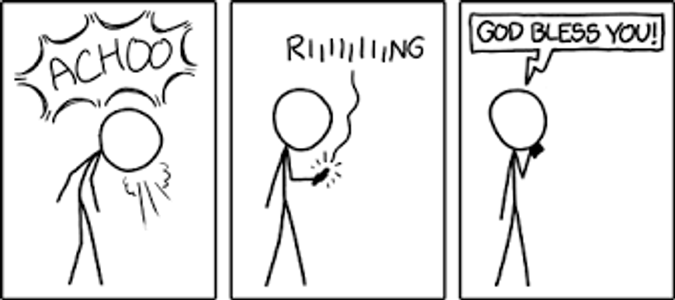 A sneeze, a sudden involuntary expulsion of air from the nose and mouth due to irritation of the nostrils. Perhaps however it's your heart stopping, maybe demons? We now know that sneezing is a natural yet involuntary act caused by a tickle in the nose, but that was not always the case. Superstition has plagued sneezing and many cultures have formed ways to protect themselves from the “evil” that comes with them. Small phrases became common to ward off demons and save the souls of those sneezing.