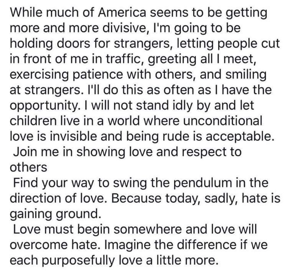 Everyone is different. Diversity is what this country is partially built from. We are a country full of differences of opinion, ethnicity, and beliefs, so treat everyone with kindness. Even those you don't agree with or may not approve of deserve to be treated with Christlike love. It doesn't matter where they're from, who they are, or what they look like. If we try to do that, we may just make it.
