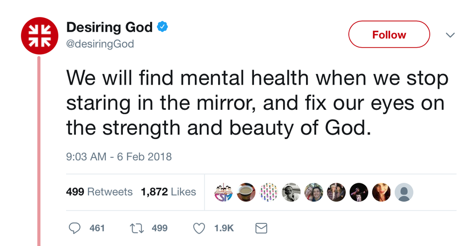 Most of the comments and retweets expressed concern that Desiring God would be promoting mental health as a metric for spiritual wellness. This statement seems to imply that depression, anxiety, and other mental illnesses are the result of selfish fixation, and the solution is to turn one’s focus to God.*