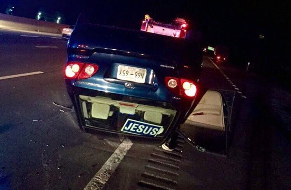 When Zac's car finally stopped, Zac hopped out. He had no bruises, no broken bones, not even a scratch. As he turned to look at his car, he saw what has to be one of the greatest signs God could ever give someone. In the back window of Zac's car was a sign that stated "Jesus," turned upright and unharmed.